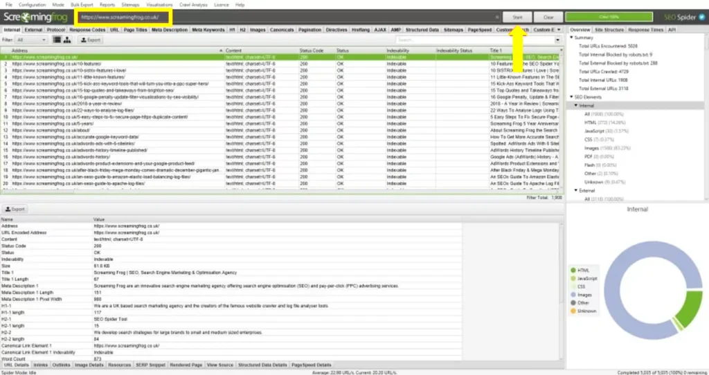 في الخطوة التالية، تحتاج إلى استخدام أدوات SEO Spider مثل Screaming Frog لاكتشاف الصفحات القابلة للزحف (Crawlable Pages) في موقع الويب. تتيح لك هذه الأداة فحص ما يصل إلى 500 رابط فريد (URL) مجانًا.